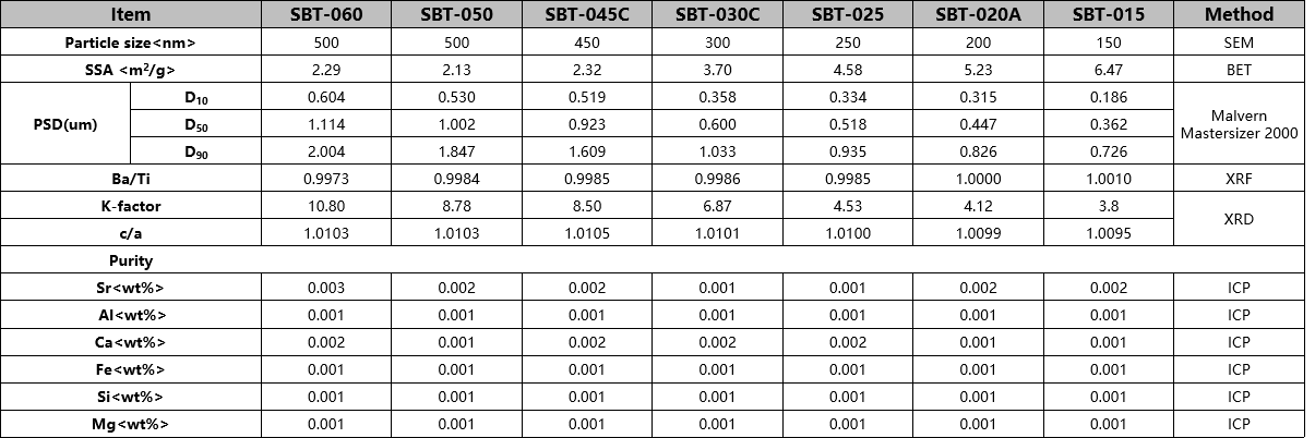 固相法钛酸钡具有颗粒形貌规则,尺寸均匀、钡钛比稳定的优劾/span>
