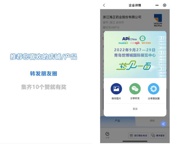 在制药家的任意店铺或产品界面,分享海报至朋友圈,并配文案‛span style="margin: 0px; padding: 0px; outline: 0px; max-width: 100%; box-sizing: border-box !important; overflow-wrap: break-word !important;">9朇span style="margin: 0px; padding: 0px; outline: 0px; max-width: 100%; box-sizing: border-box !important; overflow-wrap: break-word !important;">27-29日,API China%span style="margin: 0px; padding: 0px; outline: 0px; max-width: 100%; box-sizing: border-box !important; overflow-wrap: break-word !important;">CHINA-PHARM与您相约青岛”,集赞可获展会现场礼遇及制药家会员占/span>