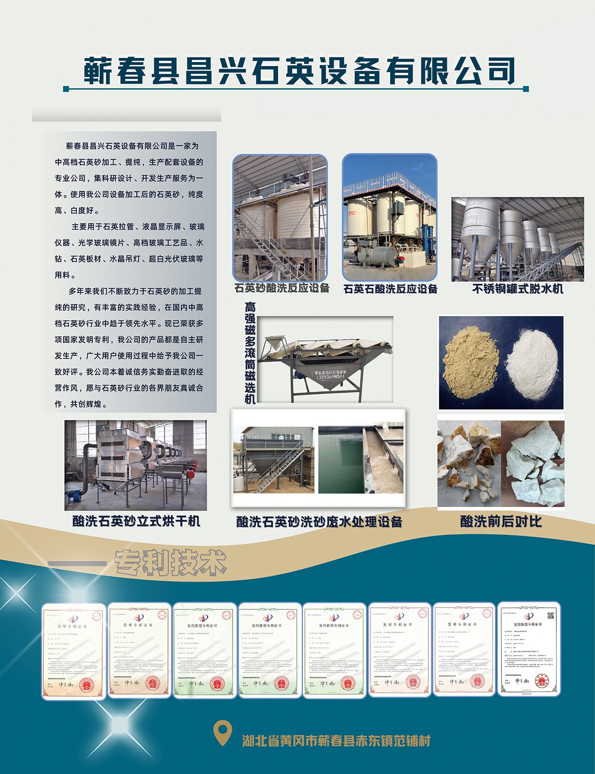 蕲春县昌兴石英设备有限公司是一家为中高档石英砂加工、提纯,生产配套设备的专业公司,集科研设计、开发生产服务为一体、/p>