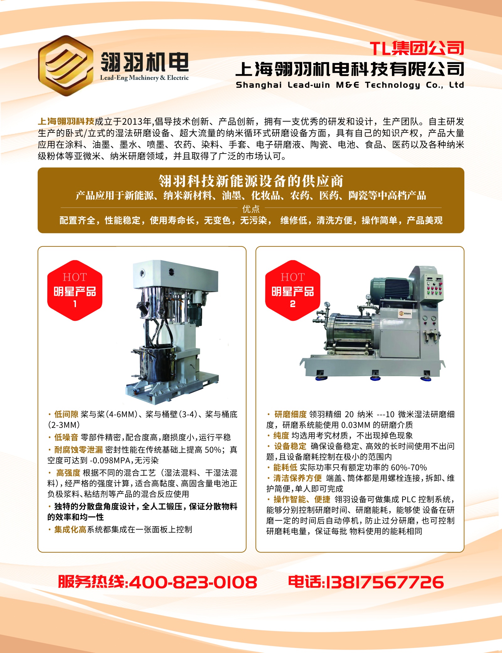 上海翎羽科技成立?013?倡导技术创新、产品创新,拥有一支优秀的研发和设计,生产团队。自主研发生产的卧式/立式的湿法研磨设备、超大流量的纳米循环式研磨设备方面,具有自己的知识产权,产品大量应用在涂料、油墨、墨水、喷墨、农药、染料、手套、电子研磨液、陶瓷、电池、食品、医药以及各种纳米级粉体等亚微米、纳米研磨领域,并且取得了广泛的市场认可、/p>