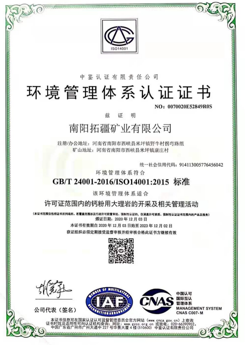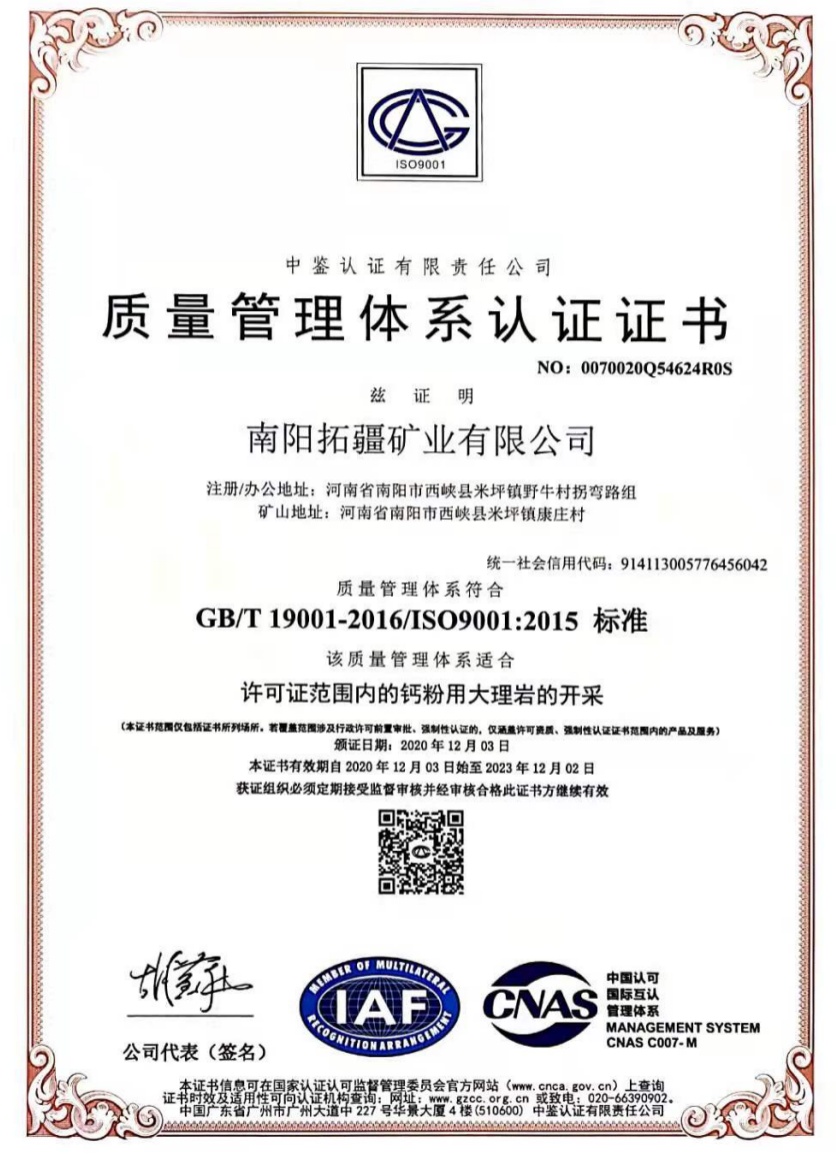 南阳拓疆矿业有限公司,位于南阳市西峡县米坪镇野牛村,成立?011年,注册资金1000万元?017年通过股权变更,经现在实际经营者扩建、改建后是目前西峡县规模较大的一家大理岩开采加工企业。本公司集矿石开采、矿石加工、钙粉销售于一体,公司占地42000平方米,职工32人,其中具有安全职称6人、/span>