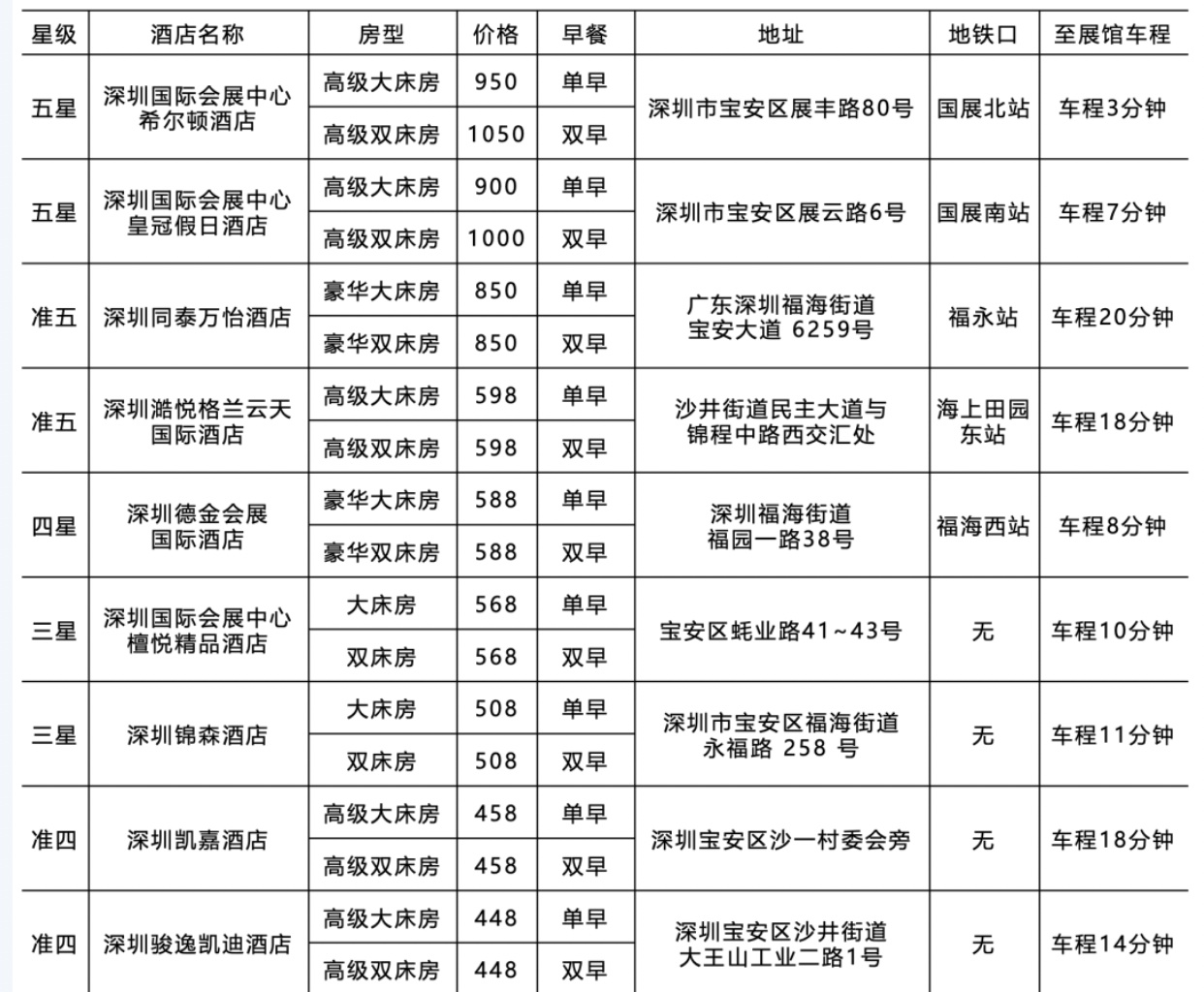 展会期间,附近的酒店都很抢手,建议您一定要提前预订。您也可以联系本次展会的指定接待商,获取返程机票、酒店预订及租车、商务旅游及其他展会解决方案等服务、/p>