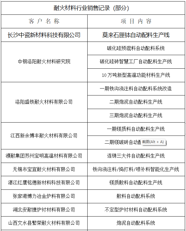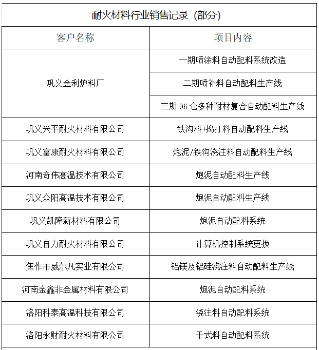 上海林福机电先后为河南、江苏、江西、湖南、湖北、山西、四川、河北等地定型、不定形耐火材料企业生产的自动配料生产线,技术路线先进、工艺设计合理、自动化程度高、计量精度高、环保绿色达标,获得了用户的一致好评、/p>