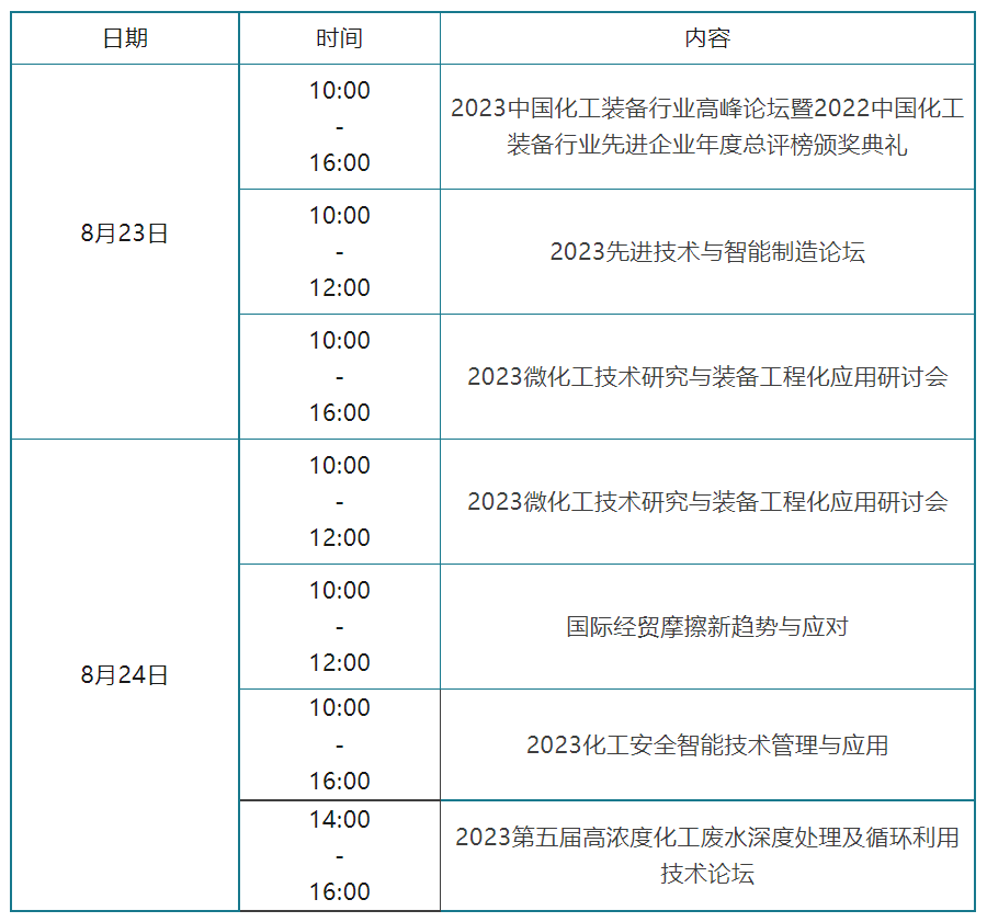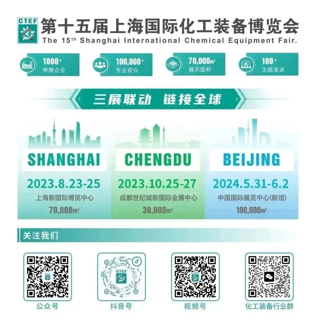 第十五届上海国际化工装备博览会将亍/span>2023平/span>8朇/span>23-25日在上海新国际博览中心举办,预计参展企业1000+,展览面积70,000m?,专业观伖/span>100,000+。展会设置石化装备、化工单元设备、换热器、蒸发结晶设备、微反应器、化工粉体加工输送、化工三废处理设备、泵阀管道、智慧化工园区、化学品储运包装、安全防爆、仪器仪表等专区 被业界誉丹/span>‛/span>一年一度的化工装备大会“/span>、/span>