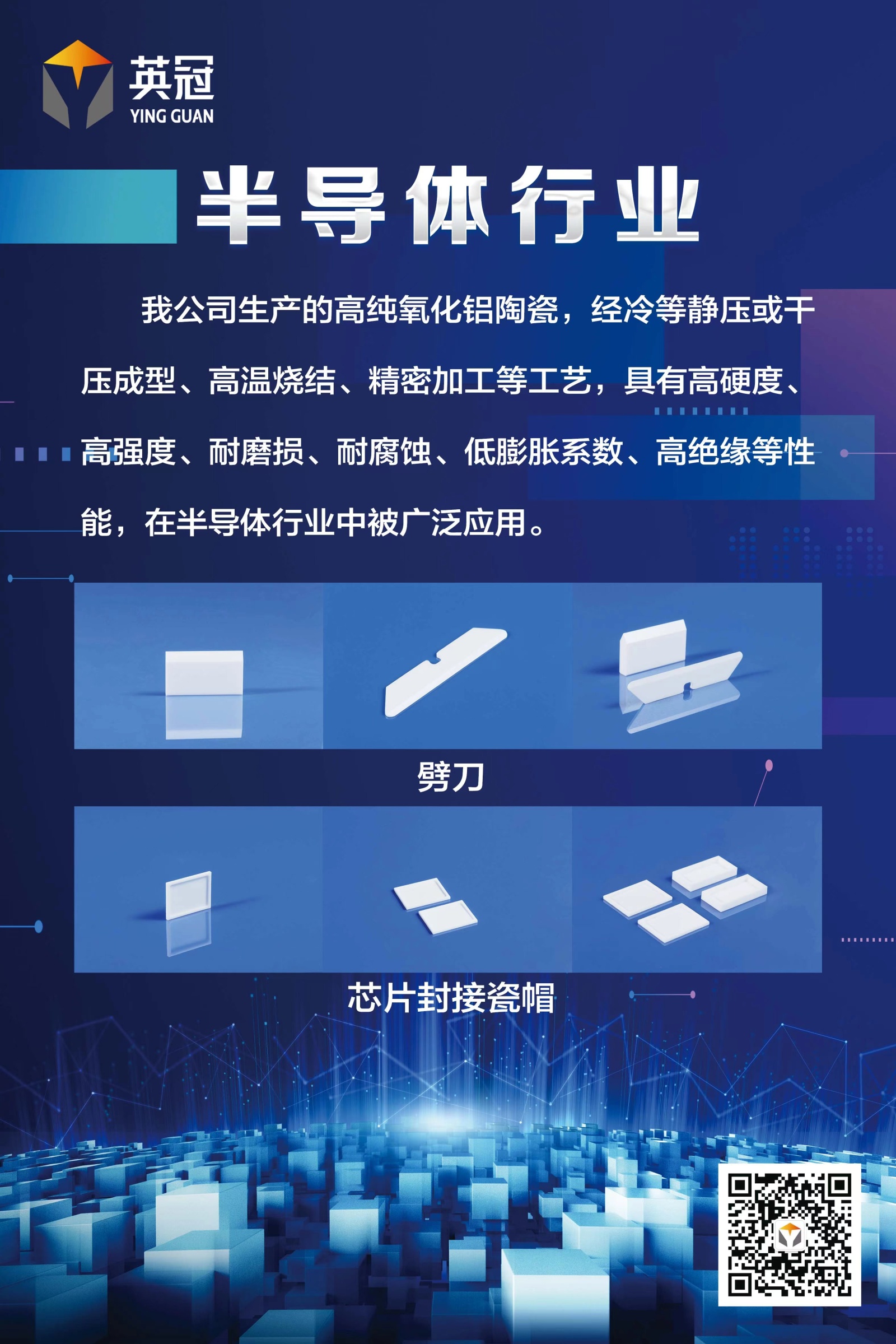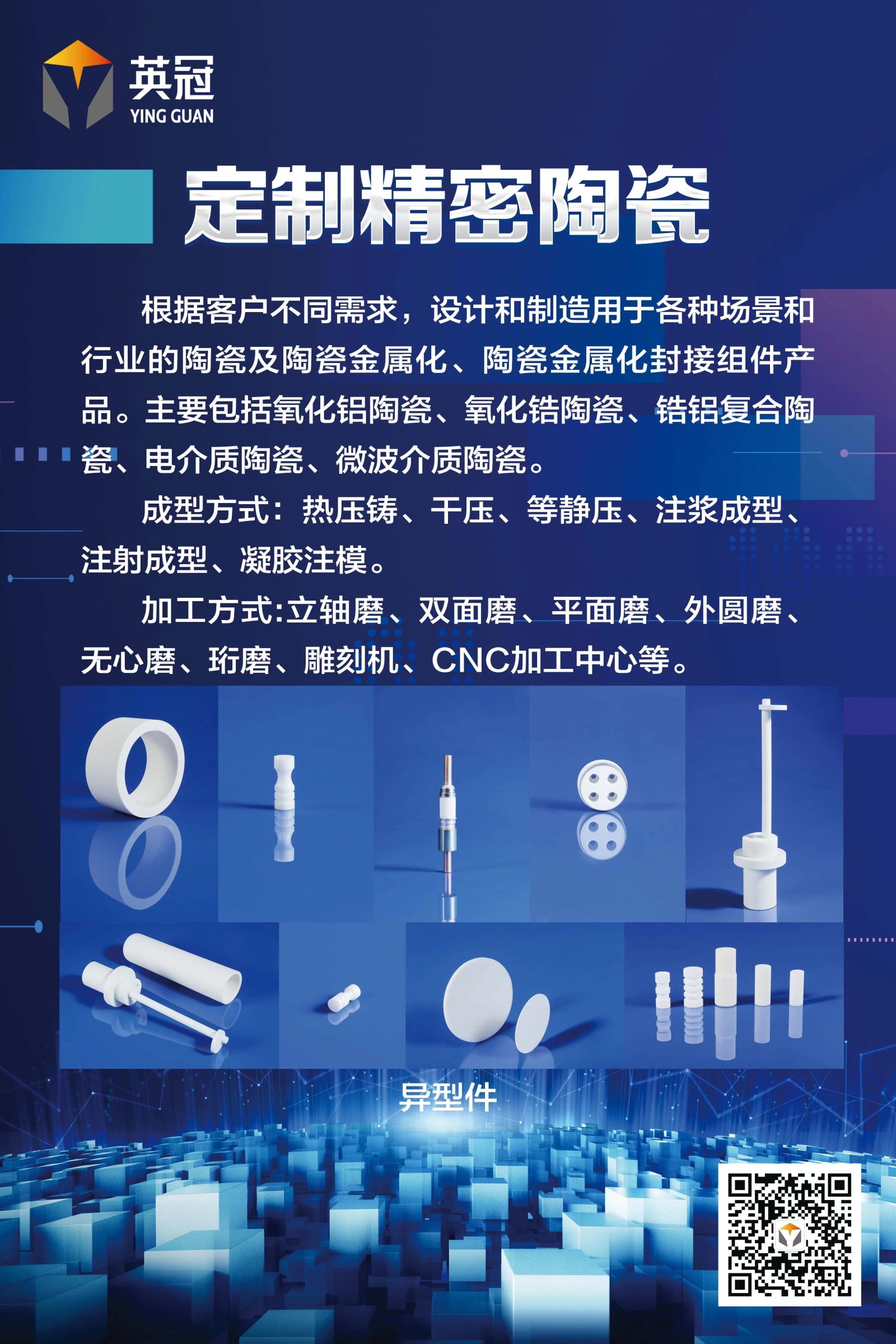 英冠陶瓷多年来深耕特种陶瓷行业,积累了丰富的研发、生产实践经验,培育了一支精干的人才队伍,具有干压、等静压、热压铸、凝胶注模等成熟工艺,拥有高温隧道烧结窑炉七座,精密陶瓷加工设备150余台,高温陶瓷厚膜金属化、磁控溅射薄膜金属化的大规模生产能力。是国家高新技术企业,具有多项发明及实用新型专利、/span>