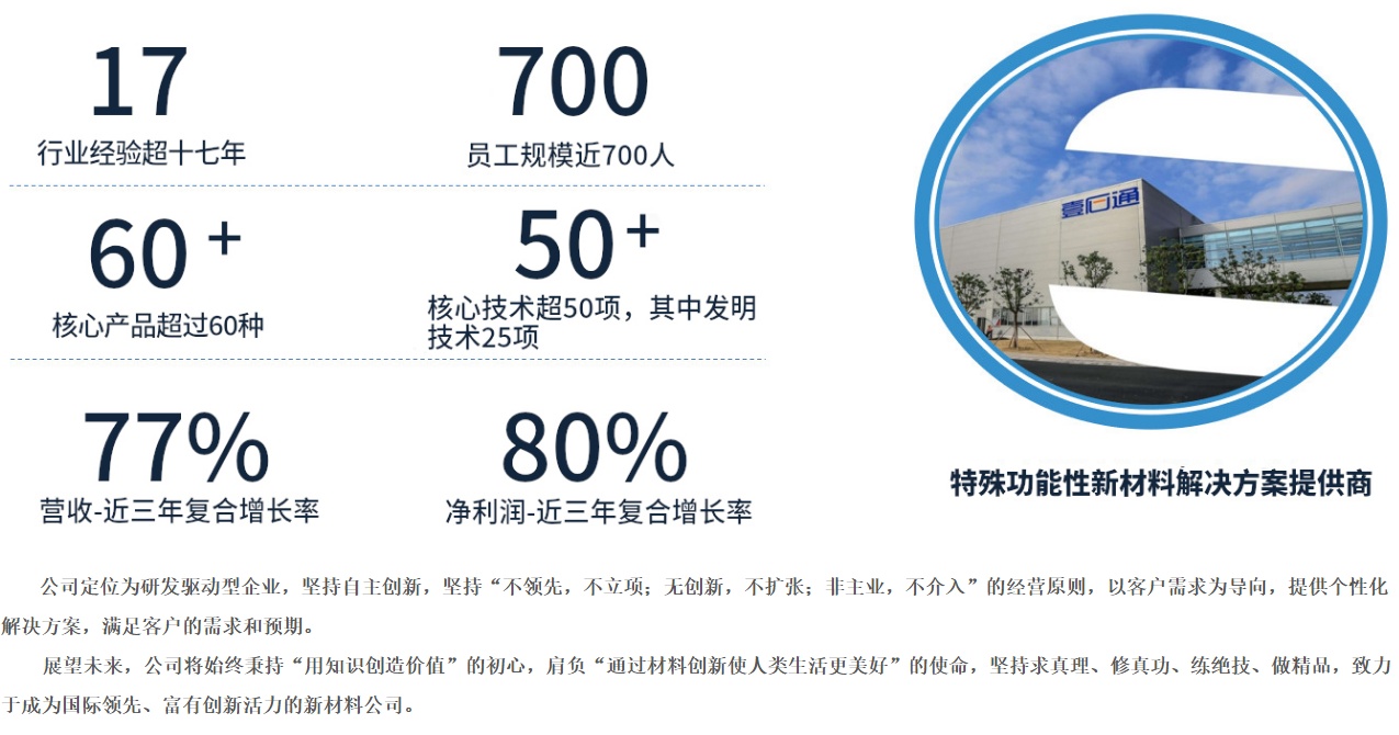 安徽壹石通材料科技股份有限公司(股票代码:688733.SH)成立于2006?月,?021??7日在上海证券交易所科创板上市,目前注册资本2亿元。公司主营产品包括新能源锂电池涂覆材料、电子通信功能填充材料、低烟无卤阻燃材料等三大类,均为保障新能源锂电池主动安全、热管理安全以及电子通信安全的关键材料。公司下游客户均为国内外行业龙头、知名上市公司等,其中锂电用勃姆石出货量和市场占有率位列全球第一,是宁德时代勃姆石产品的核心供应商,公司同时也是全球少数能够量产low-α射线球形氧化铝的企业,在高端芯片封装材料领域打破了国外垄断、/p>