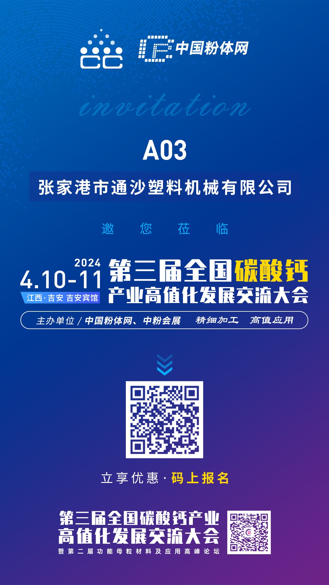 由中国粉体网主办的‛span style="letter-spacing: 0px; background: rgb(255, 255, 255); font-family: 微软雅黑; color: rgb(255, 0, 0);">2024第三届全国碳酸钙交流伙/strong>”将亍span style="letter-spacing: 0px; background: rgb(255, 255, 255); font-family: 微软雅黑; color: rgb(255, 0, 0);">2024??0-11号在江西吉安举办+span style="text-wrap: nowrap;">张家港市通沙塑料机械有限公司邀您一同参加、/span>