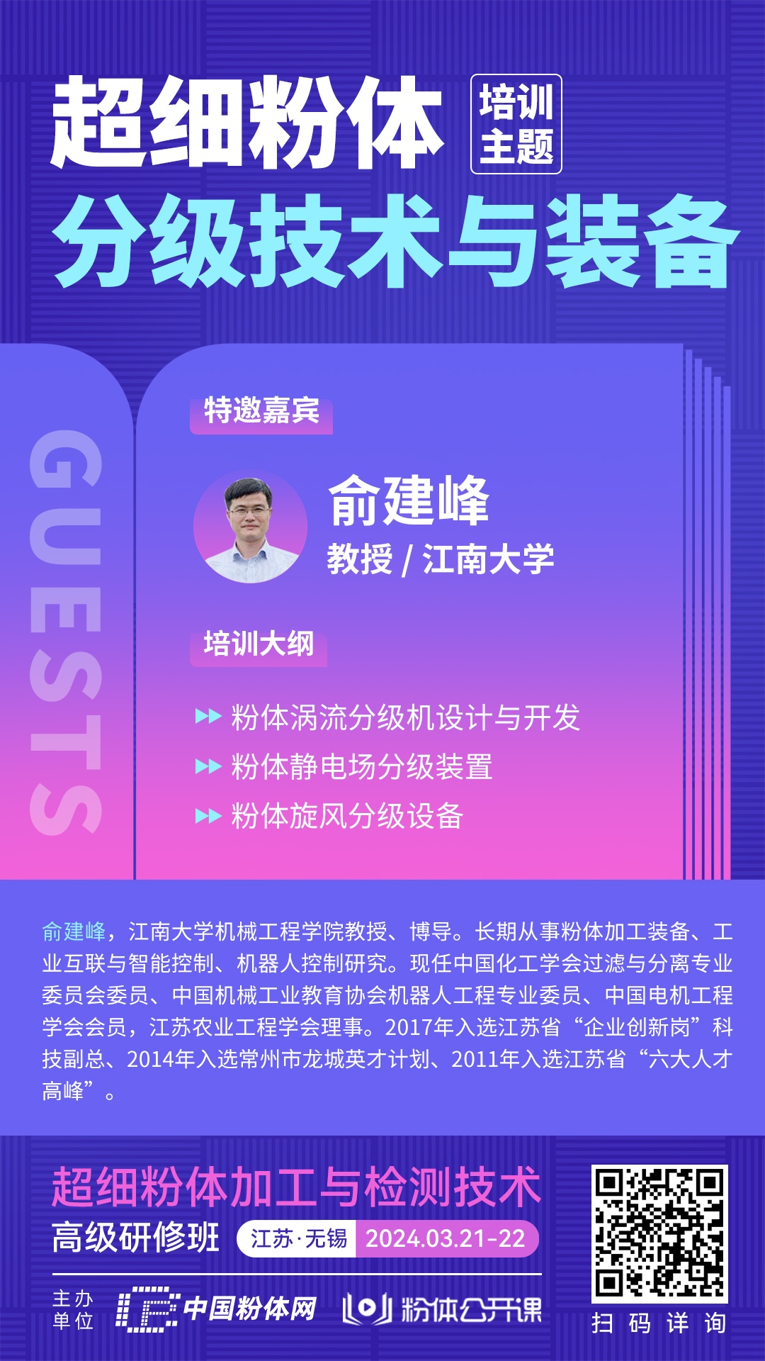 本次培训班特邀江南大学俞建峰教授带来《超细粉体分级技术与装备》!欢迎大家积极报名参会学习?/span>