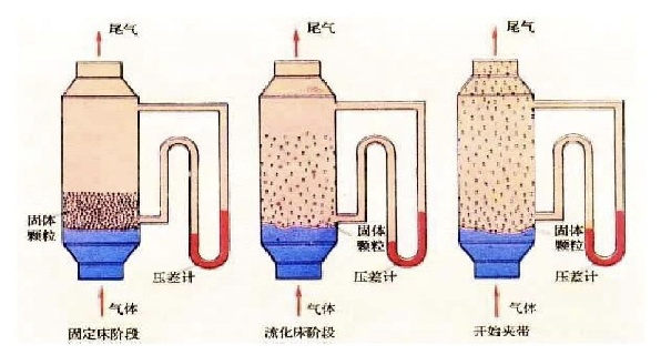 将所处理的固体破碎、研磨成细粉,增加固体与气体的接触面积,缩短颗粒内部的传递和反应距离。自下而上流经这些粉料的气体,在达到一定速度时,会将固体颗粒悬浮起来,使之不断运动,犹如流体,故称流态化、/p>
