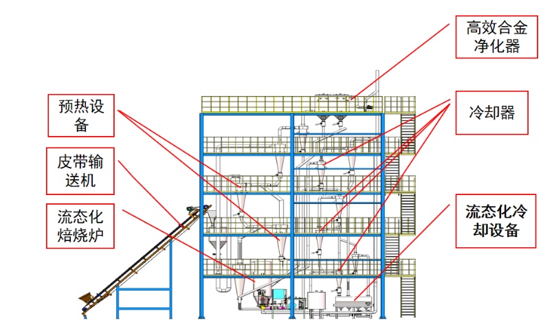 3、物料焙烧:来自高效合金净化器和预热过滤器捕集下的物料经过管路输送,与二级物料预热器预热后的物料一起进入到流态化焙烧炉中进行高温焙烧。焙烧完成后的物料随热气流进入焙烧分离器中,生产物料在焙烧分离器中得到分离、/p>