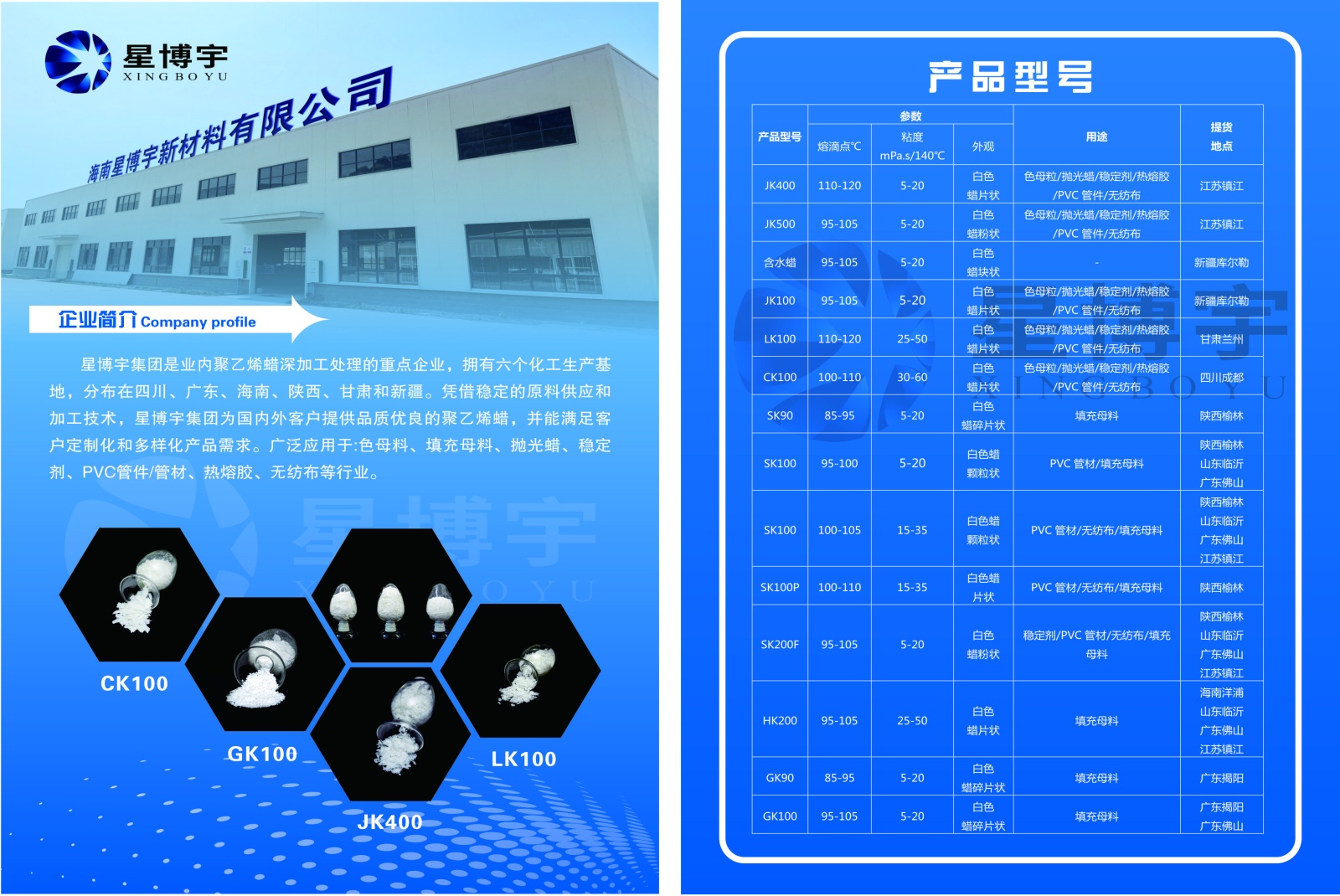星博宇集团是业内聚乙烯蜡深加工处理的重点企业,拥有六个化工生产基地,分布在四川、广东、海南、陕西、甘肃和新疆。凭借稳定的原料供应和加工技术,星博宇集团为国内外客户提供品质优良的聚乙烯蜡,并能满足客户定制化和多样化产品需求、/p>