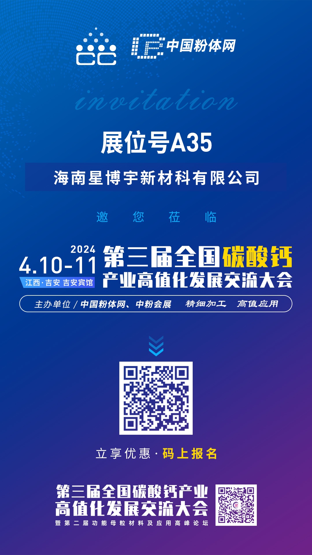 由中国粉体网主办的‛span style="color: rgb(255, 0, 0);">2024第三届全国碳酸钙交流伙/strong>”将亍span style="color: rgb(255, 0, 0);">2024??0-11号在江西吉安举办+span style="text-wrap: nowrap;">海南星博宇新材料有限公司邀您一同参加、br/>