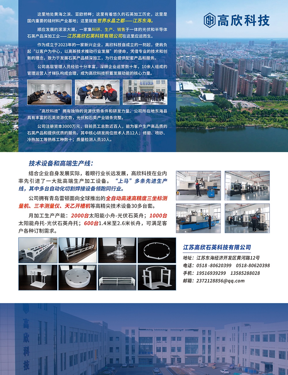 作为成立?023年的一家新兴企业,高欣科技自成立的一刻起,便肩负起“以客户为中心,以高新技术推动行业发展”的使命,凭借专业的技术和创新的理念,致力于发展石英产品精深加工,为行业提供配套产品和服务、/p>