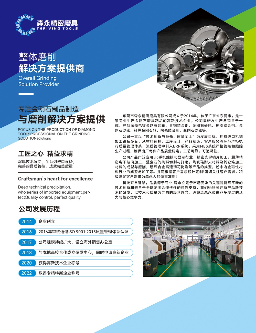 东莞市森永精密磨具有限公司成立于2014年,位于虎门滨海新区,是一家专业生产金刚石制品的生产型企业、/span>