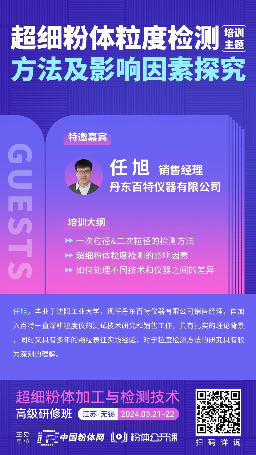 本次培训班特邀丹东百特仪器有限公司任旭销售经理带来《超细粉体粒度检测方法及影响因素探究 》!欢迎大家积极报名参会学习?/span>