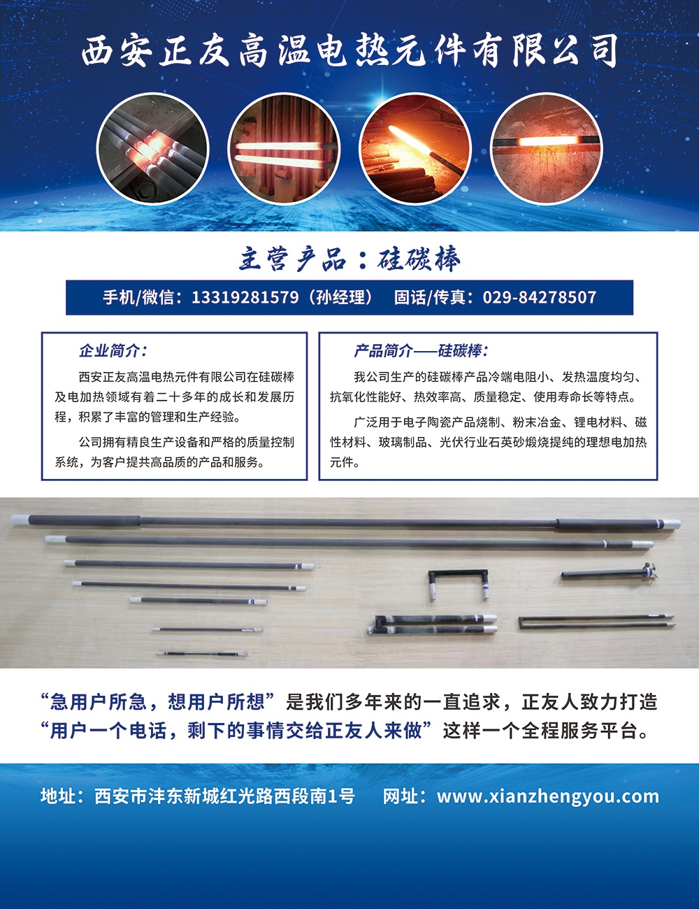 西安正友高温电热元件有限公司在硅碳棒及电加热领域有着十多年成长和发展历程,积累了丰富的生产管理经验,运用先进的工艺技术,先进的生产设备,致力为广大朋友提供一流的产品和精美的售前、售后服务、/p>