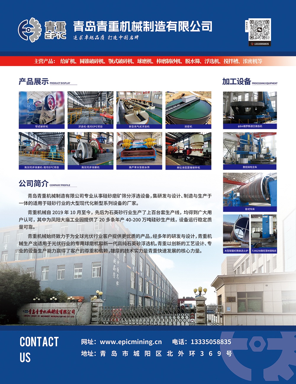 青岛青重机械制造有限公司成立于1988年,是一家专业从事全套选矿、建材、冶金、化工设备,集研发设计生产于一体的大型现代化制造型企业。主要产品有给矿机、破碎机、筛分设备、运输设备、球磨机、分级机、浮选机、浓缩机、搅拌槽等。为客户提供全套的售前服务、售中服务和售后服务、例如前期咨询、选矿试验、矿山设计、工艺流程设计、设备加工生产、安装调试、工人培训、达标达产、管理与运营等一条龙服务,为客户提供最经济的选矿方案和最高效的选矿设备、/p>