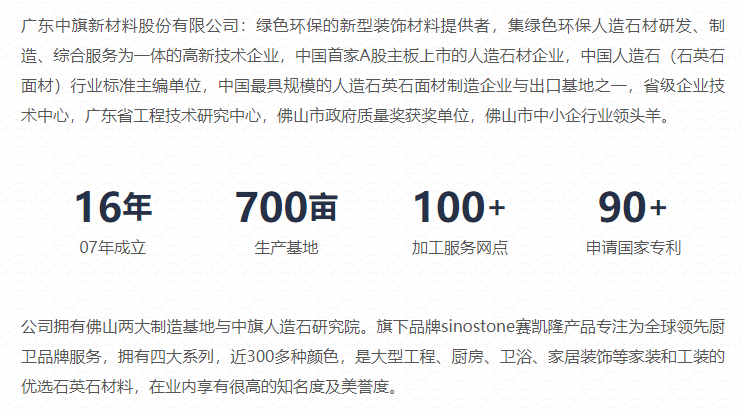 广东中旗新材料股份有限公司:绿色环保的新型装饰材料提供者,集绿色环保人造石材研发、制造、综合服务为一体的高新技术企业,中国首家A股主板上市的人造石材企业,中国人造石(石英石面材)行业标准主编单位,中国最具规模的人造石英石面材制造企业与出口基地之一,省级企业技术中心,广东省工程技术研究中心,佛山市政府质量奖获奖单位,佛山市中小企行业领头羊、/p>