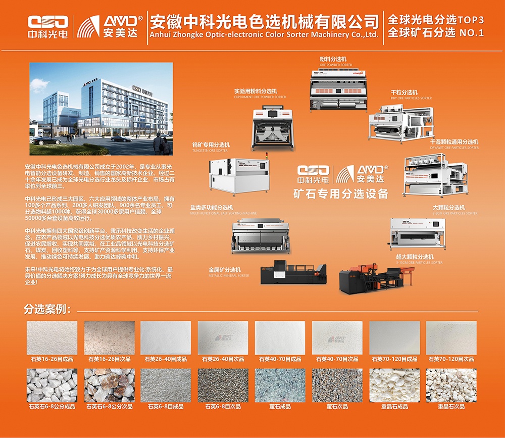 安徽中科光电色选机械有限公司坐落于中国合肥,占地面?5万平方米,总投?.5亿,员工人数760多人,科研楼25000平方米,是一家专业从事智能分选设备研发、生产、销售的高新技术企业。历经十多年的发展,已成为拥有员工超600人,销售收入?亿元的大型智能分选设备生产基地。 公司全面通过了质量管理体系认证、环境管理体系认证、职业健康管理体系认证,“安美达”系列产品通过了欧盟CE认证。严格的质量管理体系保障了公司产品和服务的质量,在全国乃至世界打响了“安美达”品牌。“色选,我们无处不在”是中科光电对于色选技术的追求和承诺。“安美达”牌系列智能色选机市场份额位列三甲,并成功远销一百多个国家和地区 公司成立专门研发中心并被认定授予“安徽省企业技术中心”和“博士后科研工作站”,且与合肥工业大学共建智慧辨识与分拣工程技术中心。先后获得自主知识产权近48项,高新技术产?项,并参与制?项安徽省地方标准。“安美达”品牌被认定为“中国驰名商标”、“安徽省著名商标”。公司先后被认定为“国家高新技术企业”、“安徽省知识产权优势企业”、“合肥市知识产权示范企业”、“合肥市两化融合示范企业”、“合肥市创新型企业”?nbsp;