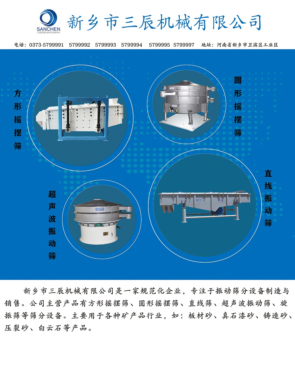 新乡市三辰机械有限公司是一家规范化企业,专注于振动筛分设备制造与销售。针对于每个行业筛分要求研发一系列行业专用振动筛,深受广大客户的青睐、/p>