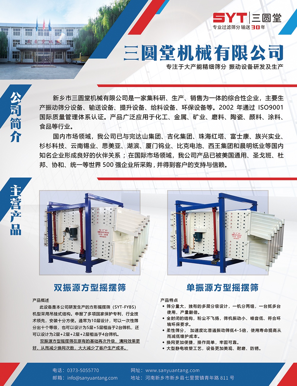 新乡市三圆堂机械有限公司位于新乡市高新技术产业区,是一家集科研、生产、销售于一体的大型振动设备企业。总占地面?000平方米,5000平方米的标准重型工业厂房,各种金属加工、铆焊、装配设备;现公司有员工100余人,中、高职业技术水平的管理人和技术人?0余人;公司先后引进美国、德国、日本、澳大利亚等国家的优良技术与工艺,公司自成立以来,引进了多台激光切割、智能下料设备,同时建立了生产线和原料加工、定制振动研究室、新型筛分研究室。公司以科学的管理方法,精益求精的制造工艺,勇于创新的制造理念迅速壮大成为中国振动机械生产基地之一、br/>