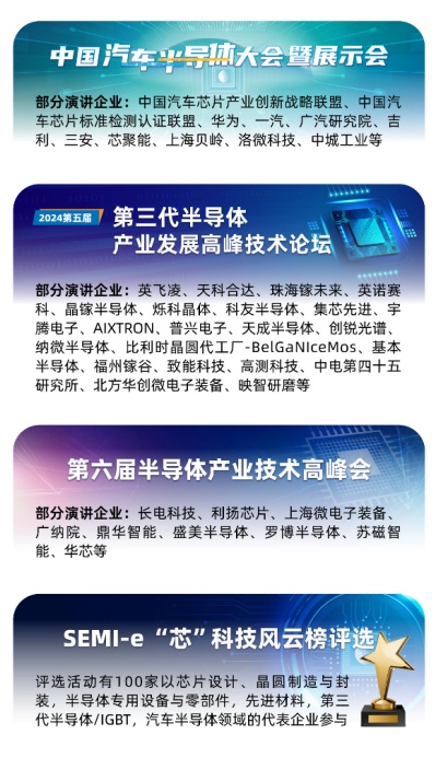 精准把握市场趋势,展会同期举办四大主题峰会,覆盖第三代半导体、汽车半导体半导体产业技术等领域话题,汇聚专家大咖探讨行业发展趋势,资讯分享和热点互动,现场带来市场趋势解码、挖掘更夙/span>“芯”思路,推进产能扩充,优质资源深度对接、/span>