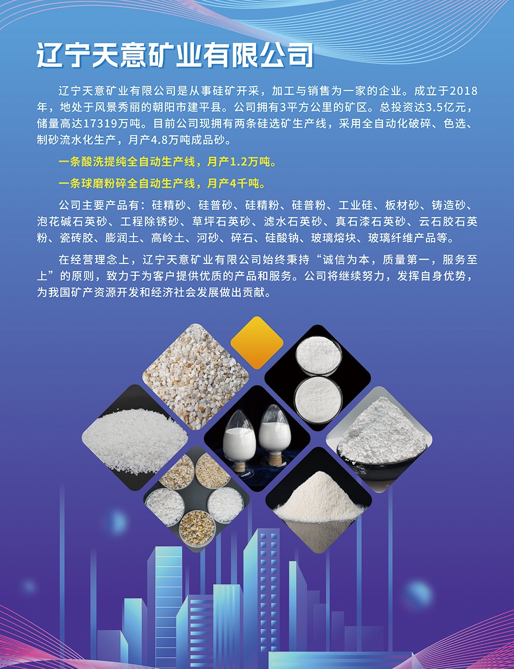 辽宁天意矿业有限公司位于矿产资源丰富、交通便利的辽宁省朝阳市建平县杨树岭乡本街,公司拥有丰富的天然石英砂矿产资源,专业从事生产石英砂,石英粉,用途广泛,品种齐全,大约分为:粗、中粗、中细粉?0多种规格。用于生产光伏、玻璃、铸钢、铸铁、防腐、过滤、建筑材料、耐火材料等、/span>