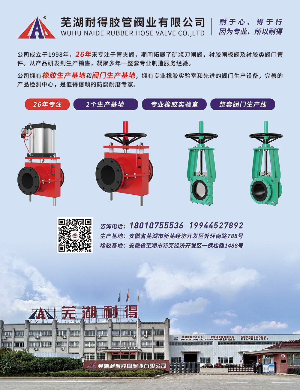 芜湖耐得胶管阀业有限公司成立于1998年,是一家集研发、生产、销售、服务于一体产学研相结合的国家高新技术企业。公司坐落在安徽新芜经济开发区外环?88号,是国内外知名胶管阀(管夹阀)、矿浆刀闸阀、衬胶类产品及提供相关定制化服务的研发生产商之一、/p>