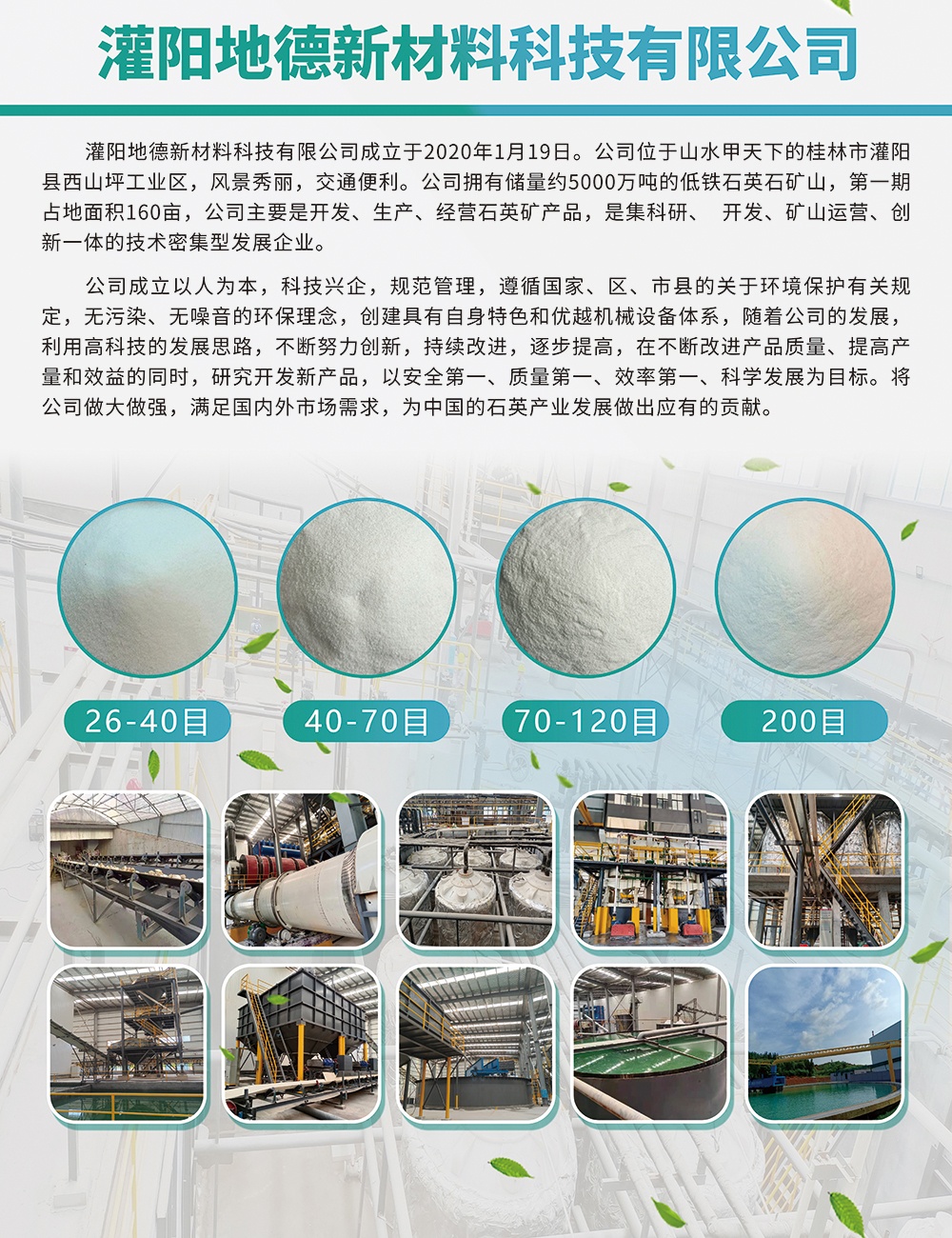 灌阳地德新材料科技有限公司办公室地址位于“山水甲天下”的桂林,广西壮族自治区桂林市灌阳县西山坪工业集中区?原灌阳县贵达有色金属有限公司),于2020?1?9日在灌阳县工商行政管理局注册成立,在公司发展壮大?年里,我们始终为客户提供好的产品和技术支持、健全的售后服务,公司主要经营新材料研发;石英矿山开釆石英矿加?石英矿沙销?建筑材料(不含河沙)生产与销售、/span>