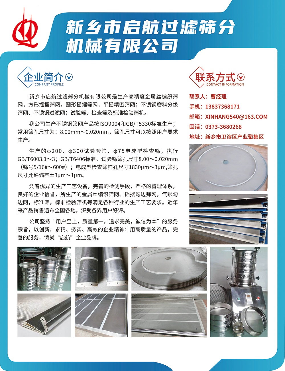 新乡市启航过滤筛分机械有限公司是生产振动筛分设备、高精度金属丝、筛网、筛分检测用具、不锈钢滤网 、过滤器、过滤设备的专业企业。凭着先进的生产工艺设备,完善的检测手段,严格的管理体系,良好的企业信誉,所生产的振动筛、金属丝筛网、过滤器,满足各种行业的生产工艺要求。近年来,各类机型销售已达数万台,产品遍布全国各地,深受各界好评、/p>