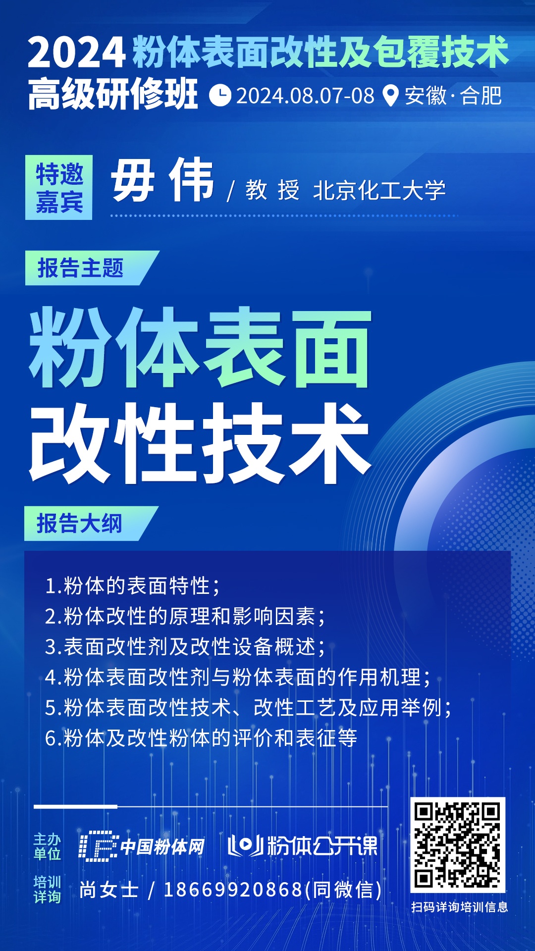 由于粉体表面的改性目的、改性工艺以及改性效果评价方法等有很大不同。特此,中国粉体网定?024??-8号在安徽·合肥组织召开2024第五届粉体表面改性及包覆技术高级研修班,邀请行业专家学者一起面对面交流探讨、/span>