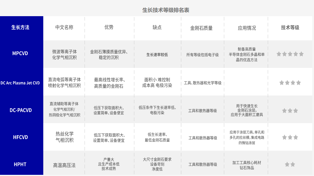 高品质、大颗粒,是对培育钻石企业在工艺水平与质控能力上的最高要求,也是企业技术研发实力的核心竞争壁垒。当前,全球培育钻石的生产方法主要有高温高压?HPHT)和微波等离子?MPCVD)两种。MPCVD和HPHT相比,在大颗粒、高净度方面更具有优势、/span>