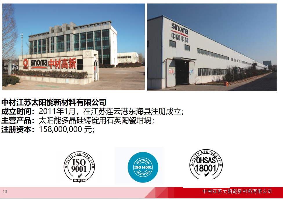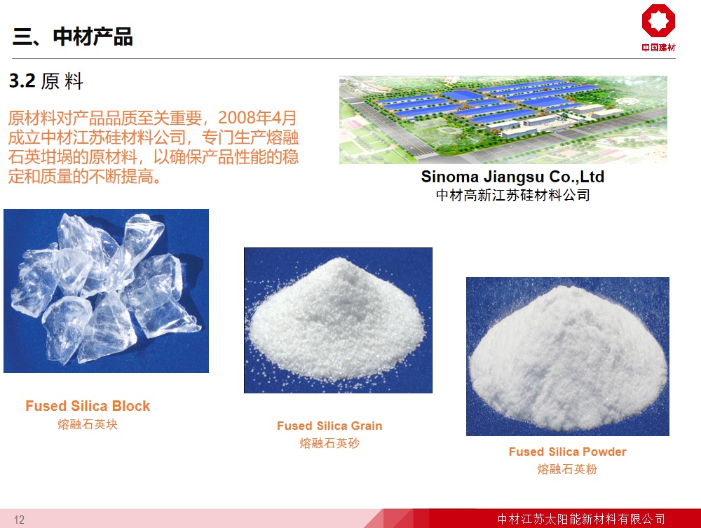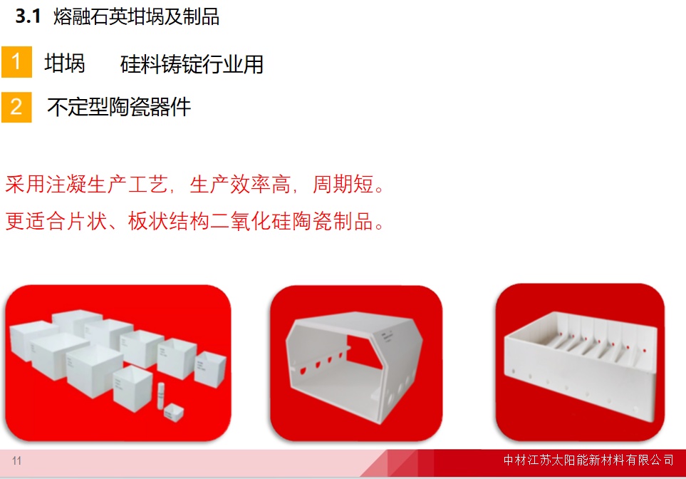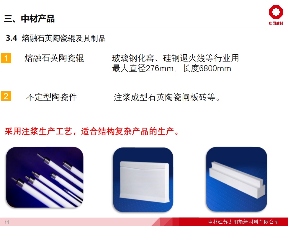 公司采用自主开发的石英陶瓷注凝成型技术生产石英陶瓷坩?为世界首?是国内唯一一家采用自主知识产权技术生产该产品的厂?产品各项技术性能指标达到或超过了国际先进水平。公司将不断致力于新技术的革新和新产品的研?以满足光伏产业的发展和振兴民族产业为己任,把中材江苏打造成世界级石英陶瓷坩埚等光伏产业用配套新材料和制品生产基地、/p>