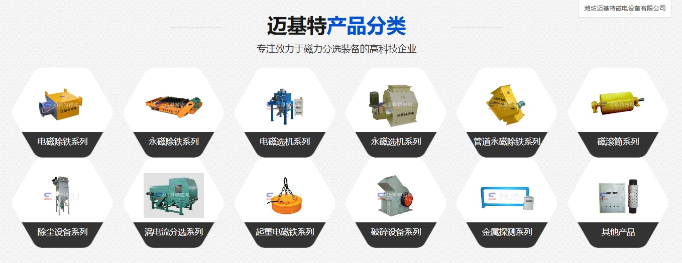 潍坊迈基特磁电设备有限公司始建于2006年,是国内大规模的致力于磁力分选装备的企业,公司集科研开发、工程设计、生产安装、调试服务于一体。主要产品有:电磁除铁器、永磁除铁器、磁选机、磁滚筒、起重电磁铁、粉料除铁器、浆料除铁器、金属探测仪、除尘设备、环保设备、破碎设备、给料机等十几个系列六百多个规格,产品销往全国各地并出口美国、欧盟、巴基斯坦、越南、新加坡、马来西亚、埃及、等几十个国家和地区,遍布冶金、电力、水泥、化工、矿山、煤炭、建材、玻璃、陶瓷、耐火材料、食品等行业,并可为用户进行特殊设计和制造、/p>