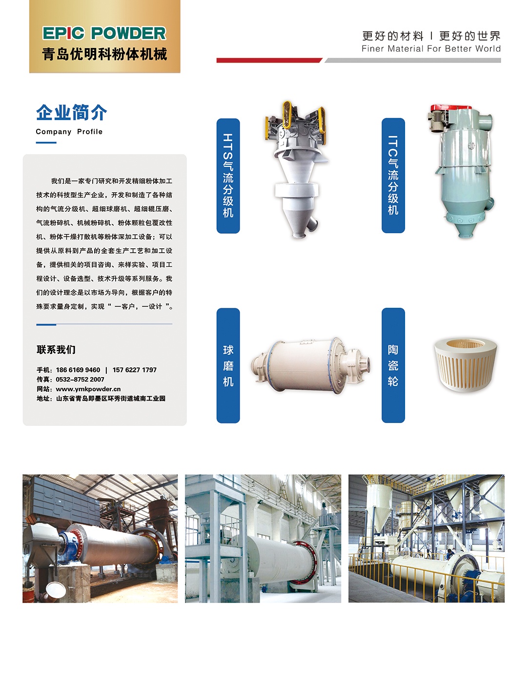 青岛优明科粉体机械有限公司是一家专门研究和开发精细粉体加工技术的企业,专业制造各种结构的气流粉碎机、机械式粉碎机、气流分级机、超细球磨分级系统、粉体颗粒包覆改性设备以及再生资源加工等粉体深加工设备;提供相关的咨询、试验、项目设计、设备生产和培训等系列服务、/p>