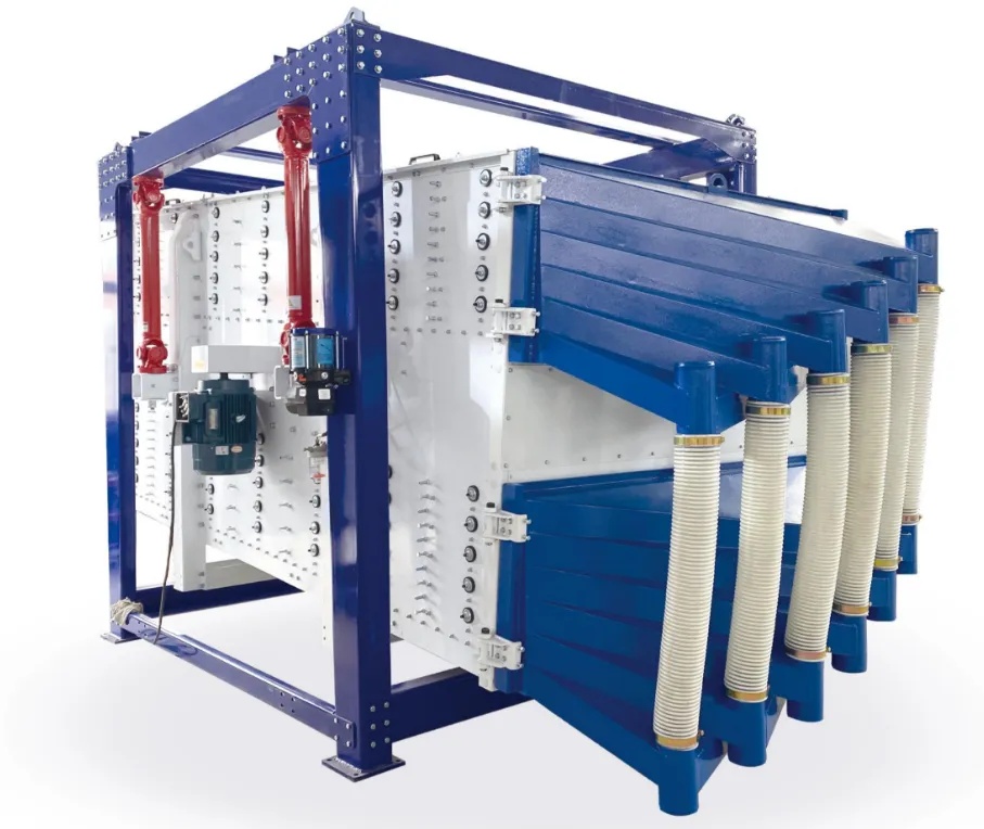 直线振动筛利用振动电机激振作为振动源,使物料在筛网上被抛起,同时向前作直线运动,物料从给料机均匀地进入筛分机的进料口,通过多层筛网产生数种规格的筛上物、筛下物、分别从各自的出口排出。具有耗能低、产量高、结构简单、易维修、全封闭结构、无粉尘溢散、自动排料,更适合于流水线作业。圆形摇摆筛圆形摇摆筛是一种仿人工摇动的低频旋振筛,物料在筛面做非线性的三维运动,既有圆周运动又有上抛弧运动,筛分精度为90-99%,筛分产量是普通振动的5-10倍,可以实现5层分级,适用?00目内圆球状、圆柱状、片状乃至不规则形状易堵网且需要精密筛分的物料、/p>