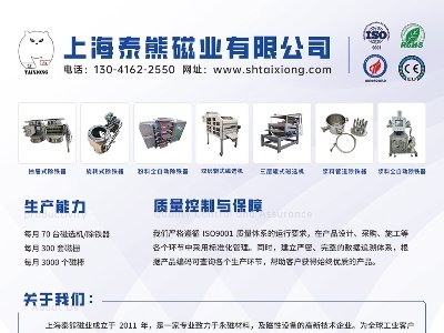 中国粉体网于2024??9日在安徽芜湖举办“第二届光伏行业用石英砂技术与市场交流大会”,泰熊磁业邀您一同参加。展位号:D21公司介绍上海泰熊磁业有限公司是专业从事磁性材料的研发、生产、加工、销售为
