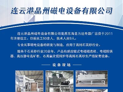 中国粉体网于2024??9日在安徽芜湖举办“第二届光伏行业用石英砂技术与市场交流大会”,晶州磁电邀您一同参加。展位号:B9企业介绍连云港晶州磁电设备有限公司从事磁电设备的研发与制?企业引进国外一