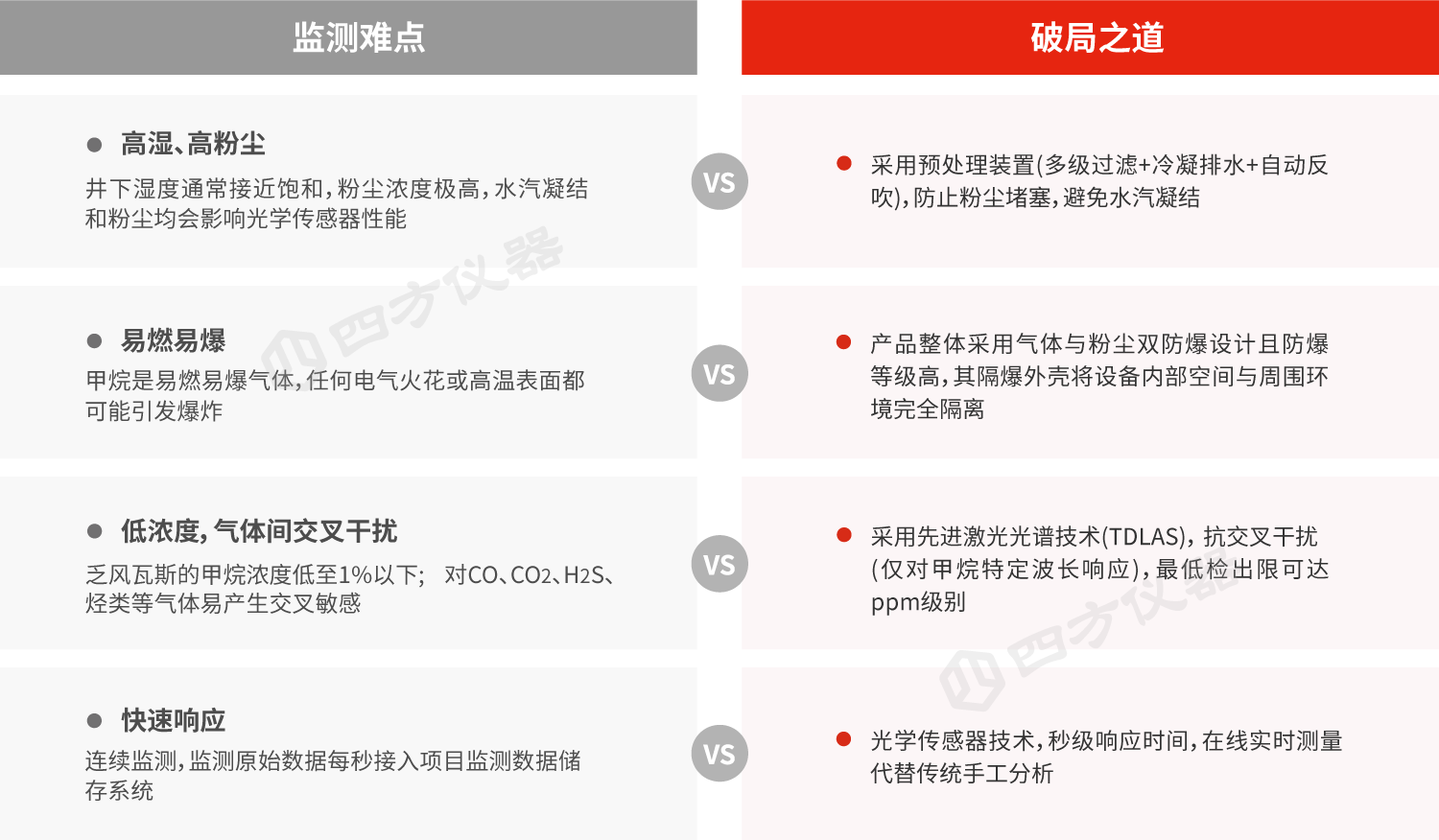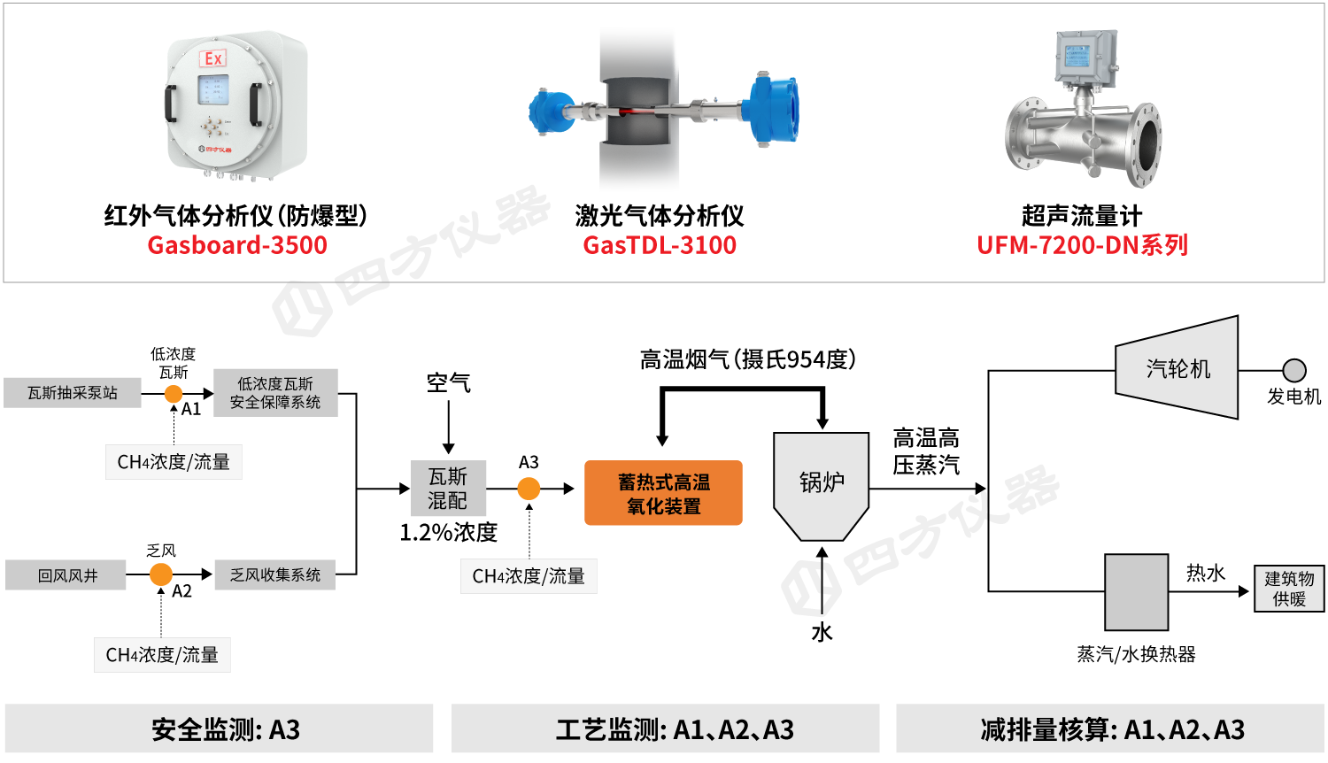 四方仪器凭借先进的气体传感器技术和工业监测设备开发经验,为煤矿乏风综合利用领域量身定制了一套气体监测综合解决方案。该方案集成可调谐半导体激先/span>(TDLAS(/span>、超声波等多种气体传感技术,实时在线监测泵站出口、输送系统、掺混器前后端等关键点位的浓度与流量,有效保障安全生产、优化瓦斯抽采输送利用方案,并为后期甲烷减排量核算提供精准数据支撑、/span>