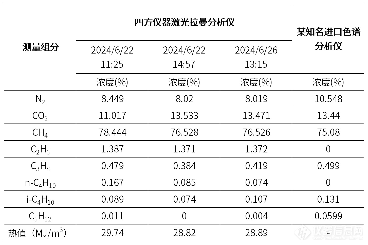 现场多组数据显示,四方仪器LRGA-6000的测量结果与进口设备高度吻合,并且多次测量的数据稳定统一。更加重要的是,在乙烷(C2H6)、正丁烷(n-C4H10 等组分上,LRGA-6000给出了稳定、精确的读数,而进口色谱仪则未能有效检出(读数?),显然,激光拉曼光谱气体分析仪将能更加真实地反映气体成分、/span>