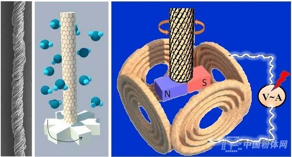 图示:螺旋石墨烯纤维在湿度改变下带动磁铁旋转产生电能