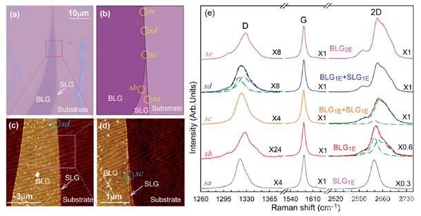 最近,中国科学院半导体研究所博士生张昕、厉巧巧和研究员谭平恒等人,对MLG边界的拉曼散射进行了系统研究。他们首先对MLG边界进行了归类,发现N层石墨烯(NLG)的基本边界类型为NLGjE,即具有完美边界的jLG置于(N-j) LG上。因此,双层石墨烯(BLG)的边界情况可分为BLG1E+SLG1E和BLG2E两种情况。研究发现:?)NLG1E边界与具有缺陷结构的NLG的D模峰形相似,?D模则为NLG?N-1)LG?D模的叠加。(2)在激光斑所覆盖区域的多层石墨烯边界附近,相应层数石墨烯?D模强度与其面积成正比,而相应的D模强度则与在临界距离内的对齐距离(如果h
