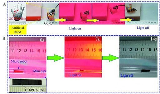 A图:一只石墨烯纸制作的人工手在光源明灭中抓取了小物件。B图:一个石墨烯制作的微机器人在小管中用14秒受控爬行了几厘米、/center>