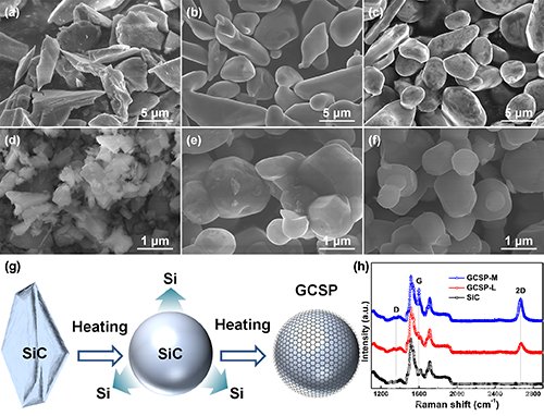 ?. (a-c) 5 μm (d-f) 0.5 μm粒径的原始SiC、GCSP-L(石墨烯1-3层)和GCSP-M(石墨烯4-9层)粉末的SEM形貌?g)为原始SiC颗粒向GCSP衍化的示意图?h) 包覆两种不同层数石墨?SiC颗粒的Raman谱、/center>