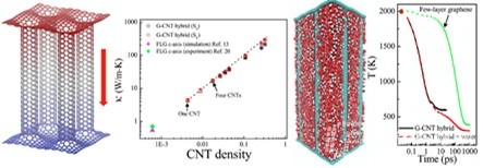 中国粉体网讯同济大学声子学与热能科学中心陈杰研究员与瑞士苏黎世联邦理工学?ETH) Koumoutsakos教授研究小组合作,提出了一种显著提高石墨烯层间导热性能的新方法:用sp2共价键(强相互作用)来代替石墨烯层间范德华力(弱相互作用),构造无缝连接的石墨?碳纳米管混合结构。通过计算机模拟,该团队发现相比于范德华相互作用,共价键连接极大地提高了石墨烯中的晶格振动模式(声子)在垂直方向的传输系数,使得该混合结构沿垂直方向的热导率比相同厚度的多层石墨烯高出2个数量级,并且该混合结构的热阻比最先进的(the state-of-the-art)导热界面材料低3个数量级。因此,该混合结构既能通过石墨烯提供良好的接触面,降低接触热阻,同时具有优异的垂直方向导热性能,是理想的导热界面材料。最后,该团队还展示了通过流体将固体混合结构中的热量移除,提供了一种基于石墨烯-碳纳米管混合结构冷却高温表面的可行方案