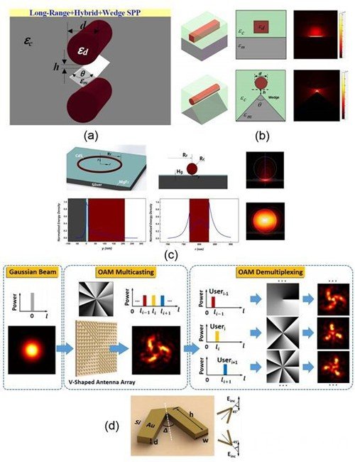 ? (a) 设计的long-range hybrid wedge plasmonic (LRHWP) waveguide结构?b) 楔形hybrid plasmonic terahertz (THz) waveguide结构; (c) 环形谐振器的三维和二维结构示意图及模式的能流密度分布?d) 基于V型天线阵列OAM广播的概念和原理、/center>