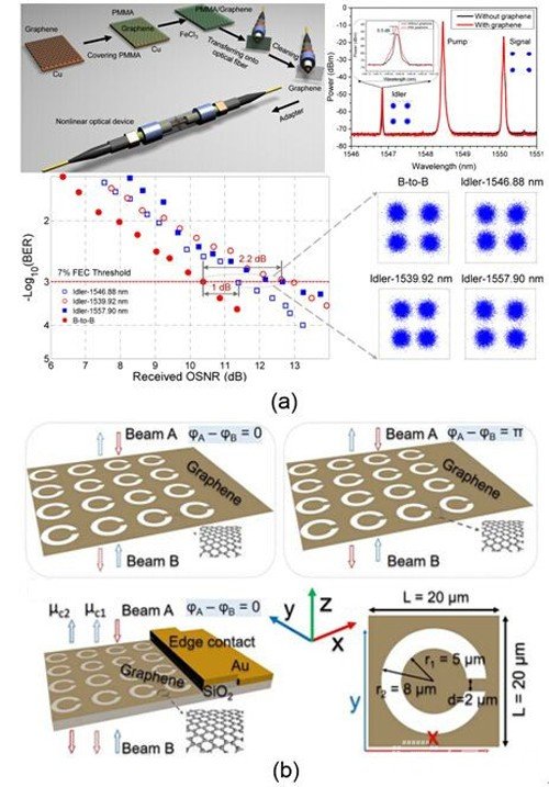 ? (a) 石墨烯制备工艺流程图、石墨烯增强四波混频效应光谱图、QPSK波长转换BER曲线及星座图; (b) 太赫兹波段基于石墨烯开口谐振圆环可调节CPA工作原理、/center>