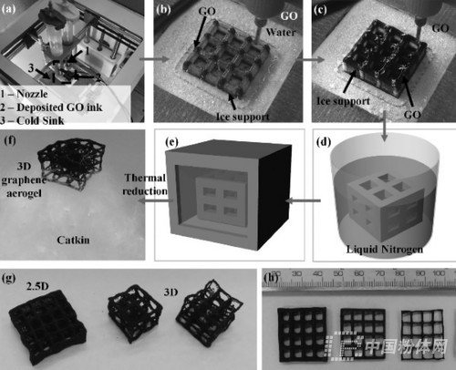 他们将石墨烯氧化物与水混合在一起,然后再零?5摄氏度的温度下将?D打印到一个表面上。这样每打印出来的一层都会被冰冻住,然后在冰的支持下再打印下一层。而且,他们发现当沉积这些石墨烯氧化悬浮物到冷冻结构上时,未冻的材料会解冻已经结冰的表面,从而造成层与层之间自由混合并重新结冰,形成了氢键和并改善了气凝胶结构的完整性。另外通过使用第二个注满纯水的3D打印机喷嘴,他们也可以创建复杂结构,因为水形成了冰支撑,在此基础上他们就能层积石墨烯氧化悬浮物、br/>