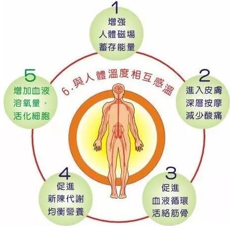人体远红外线的吸收机制是通过人体组织的细胞分子中的碳-碳键,碳-氢键,氧-氢键等的伸缩振动,其谐振波大部分?-15 微米,和远红外线的波长和振幅相同,引起共振共鸣。石墨烯加热发射?-15微米远红外波,能有激活身体细胞核酸蛋白质等生物分子等功能,起到改善血液循环、改善关节疼痛、调节自律神 、提高免疫功能、消炎功能、增强生物体的新陈代谢以及护肤美容、改善体内微循环的作用!