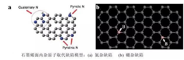面内杂原子取代缺陷:一些原子如氮、硼等,可以形成三个化学键,因此可以取代石墨烯中碳原子的位置,这些杂原子构成了石墨烯面内杂原子取代缺陷、/span>